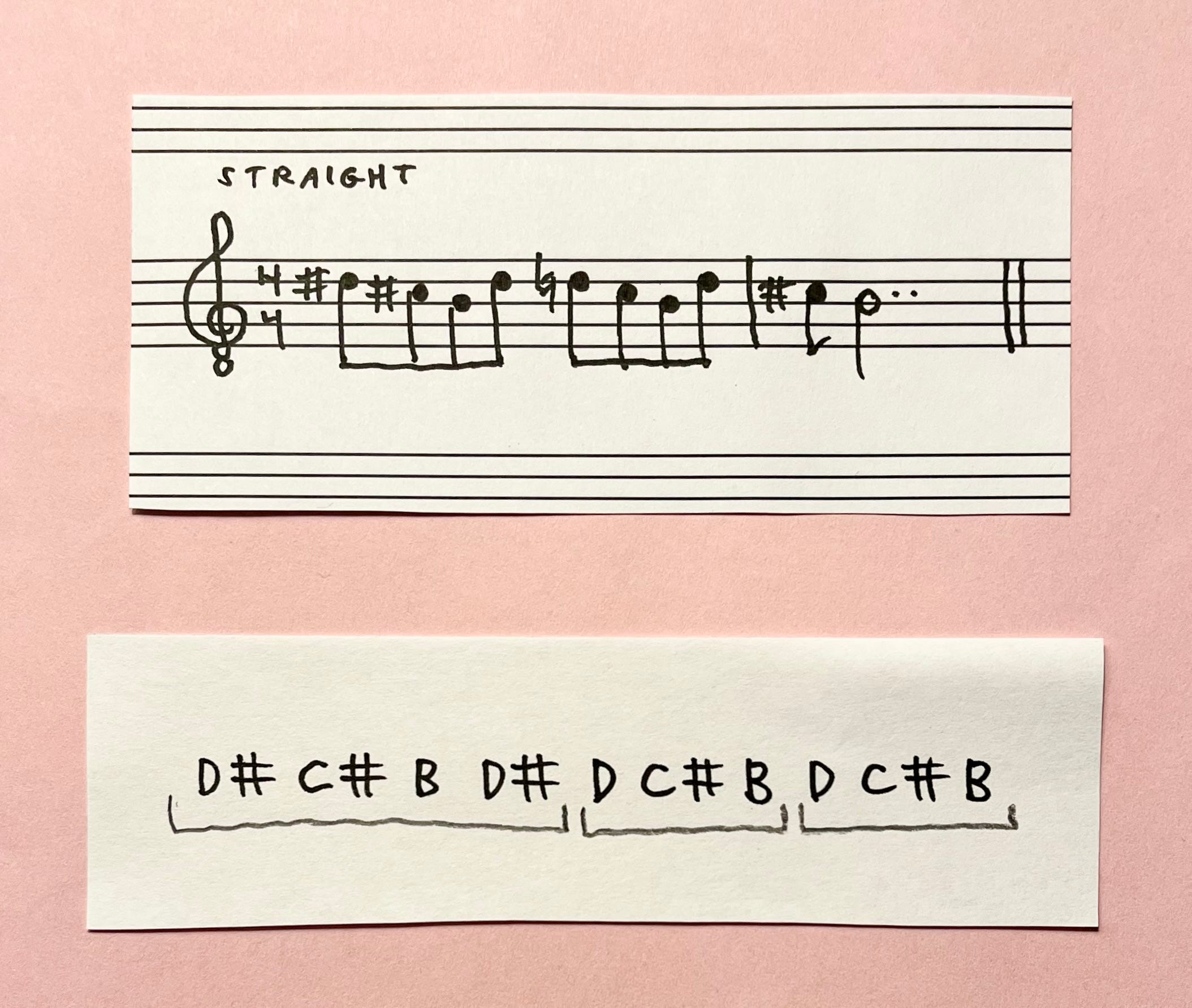 (My analytical side is engaged, to varying degrees, while writing, and then I forget that stuff. What I’m left with is recordings I feel like I deeply understand as a listener, but I couldn’t tell you the details or play any of it. (If I need to relearn my own music and there’s no paper* at hand, I have to transcribe it as if it was written by someone else.) In this case—especially in the case of melodies—I was never deeply engaged analytically at all. I sang things out, and then just wrote down what I did. All this to say, this melodic analysis I’m doing now is the first time I’ve looked at this music this way.)