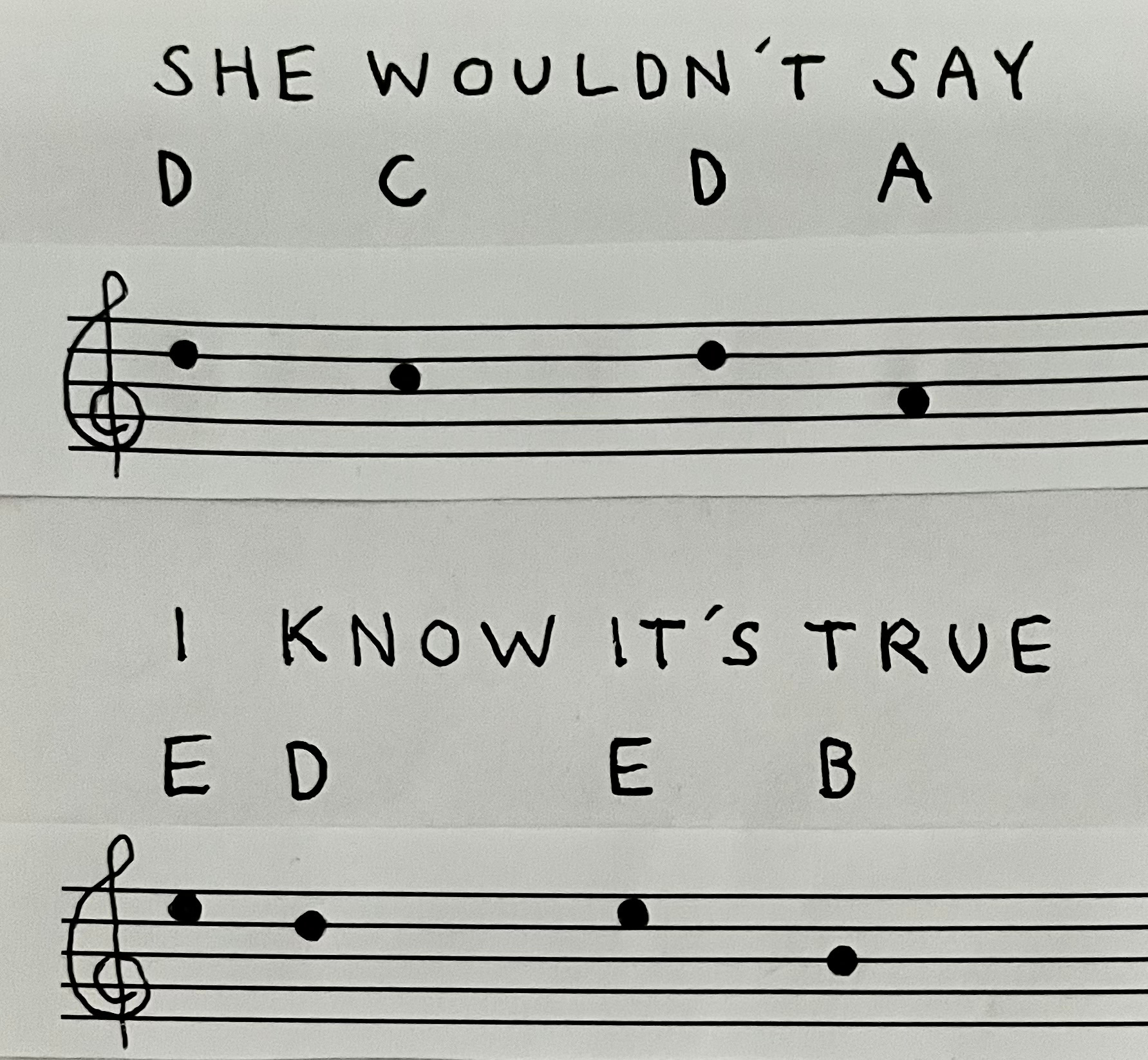 At first the fragment appears to be a whole-step up from the source, but then consider: when John Lennon played “Yesterday” on the 1966 tour, it was in G, not F. In fact, Paul had always played it in G, but he’d tuned his guitar down a whole-step when recording it in 1965, probably to make the high notes easier to sing (though the lower tuning also adds depth to the lone acoustic guitar the arrangement is built on). On the ‘66 tour, it was apparently deemed impractical for George and John (who were both pretty much playing Paul’s original guitar part on electrics (with Paul on bass)) to retune or switch guitars, so Paul just strained a little for the higher key. But to John, “Yesterday” was in G, and if you take that into account, then “Now And Then” borrows exactly the “Yesterday” notes, untransposed.